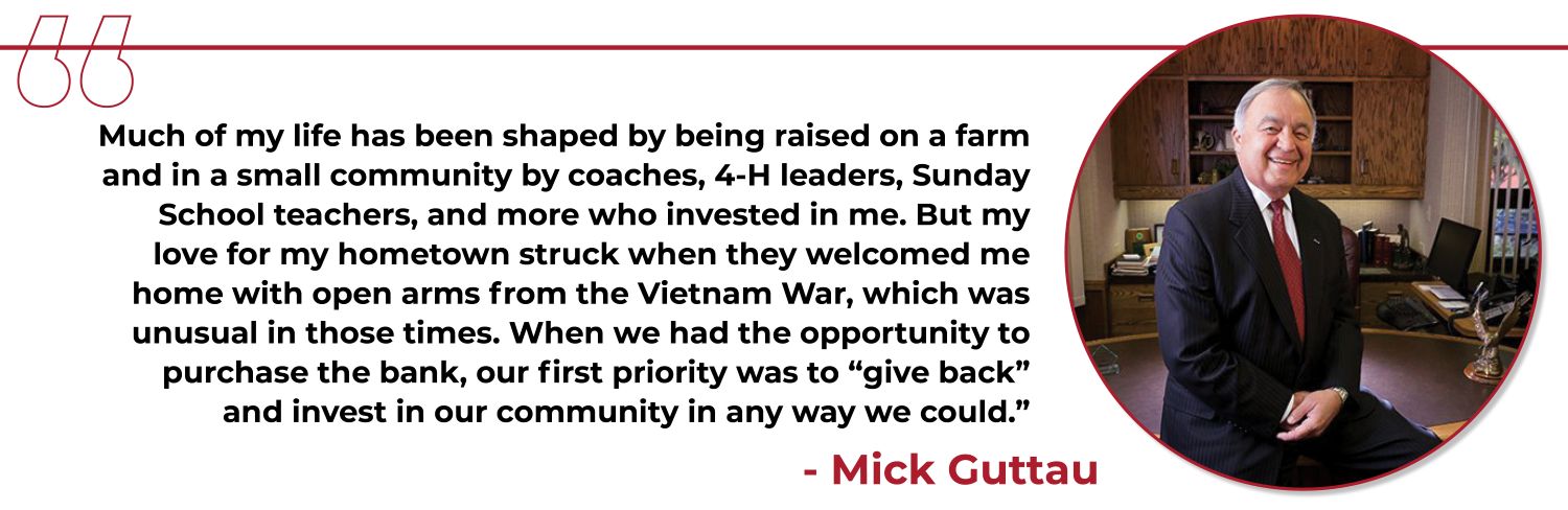 TS Banking Group began with a bold vision and a deep commitment to community. In 1978, Mick and Judy Guttau faced a pivotal moment in their lives. Mick, a Vietnam War Cobra helicopter pilot turned banker, and Judy, a marketing leader and community advocate, were raising young children and searching for a way to make a lasting impact. When the rare opportunity arose to purchase TS Bank, they seized it using the family farm as collateral and working side-by-side for over 40 years to transform a small-town bank into a catalyst for community prosperity.